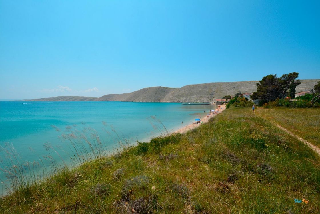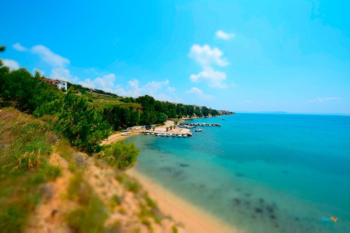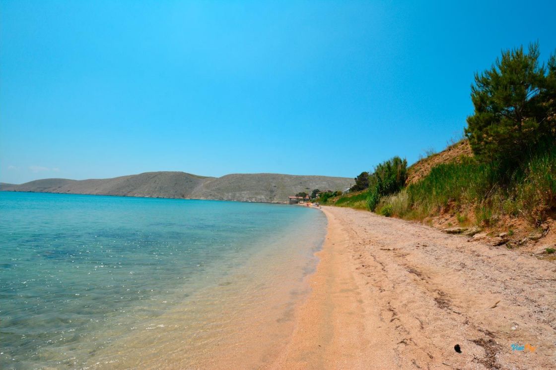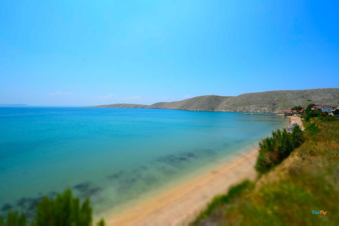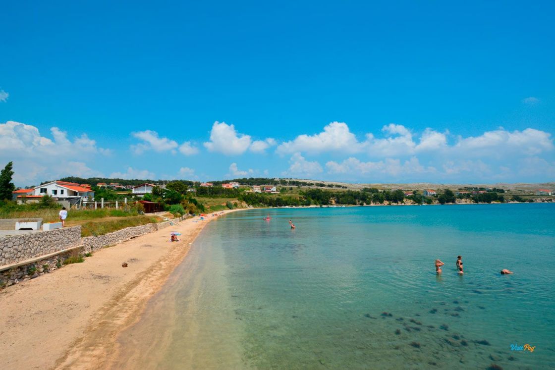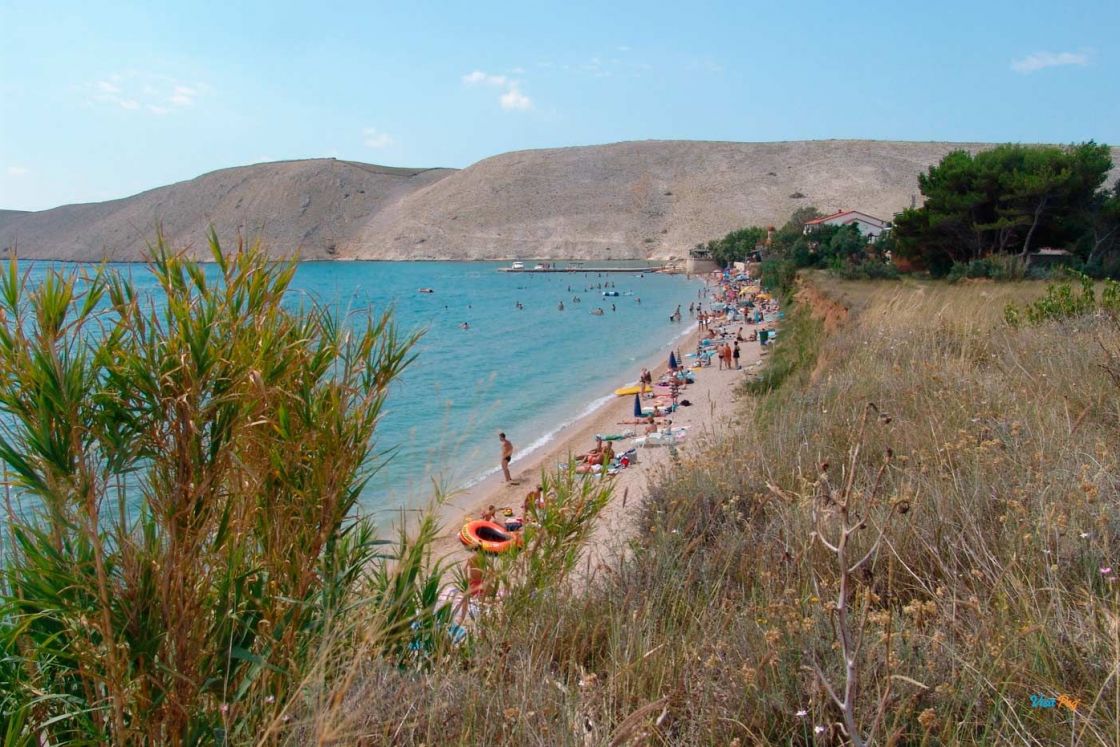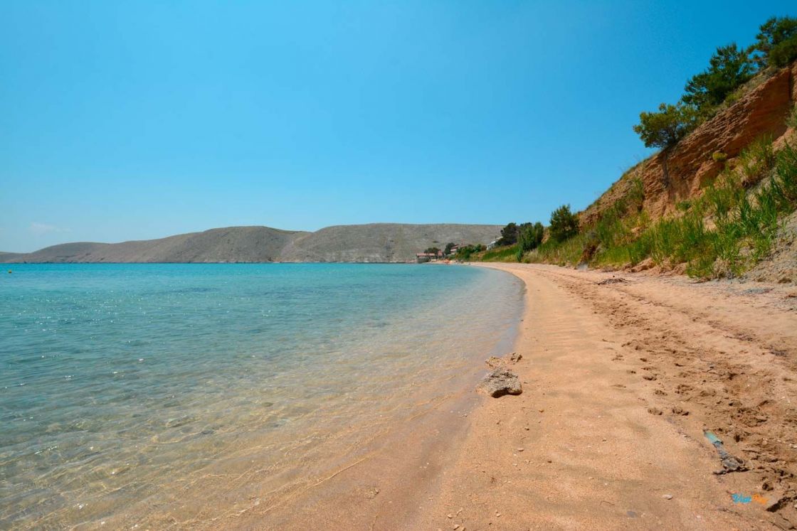 La spiaggia di Vlašići, lunga 800 metri, è una delle spiagge più belle di Pag - è particolarmente adatta per essere circondata da un muro di terra rosso naturale.