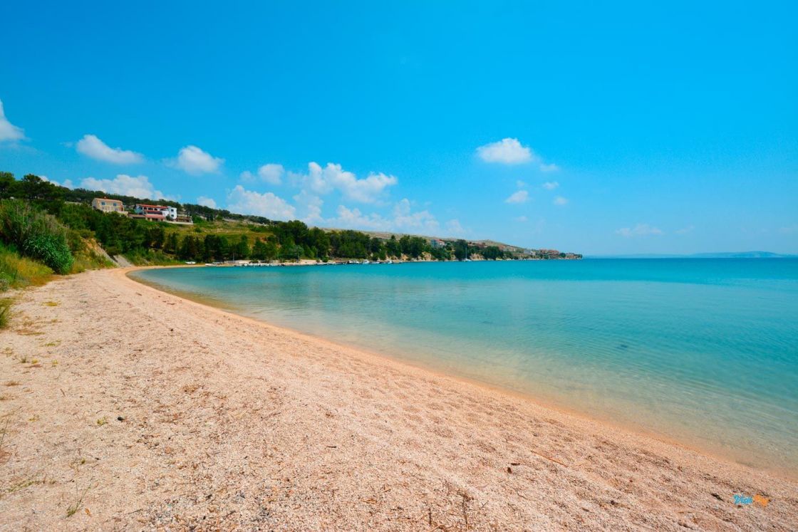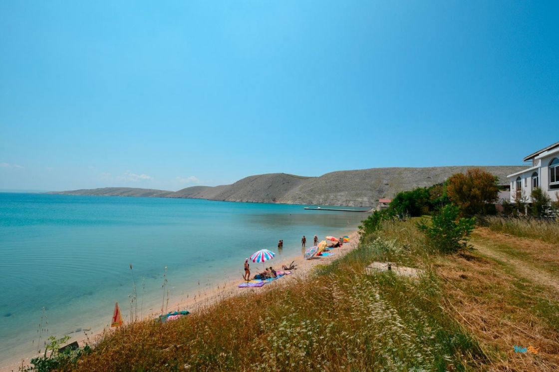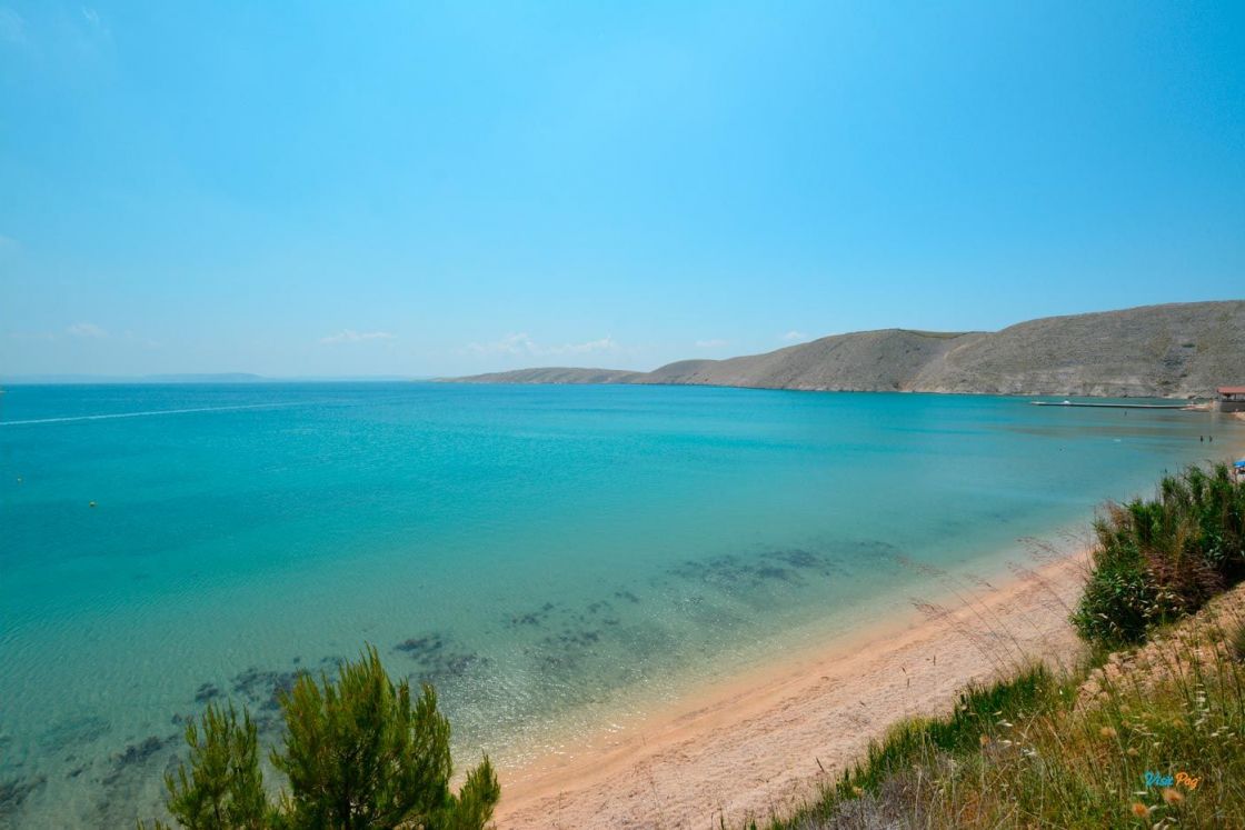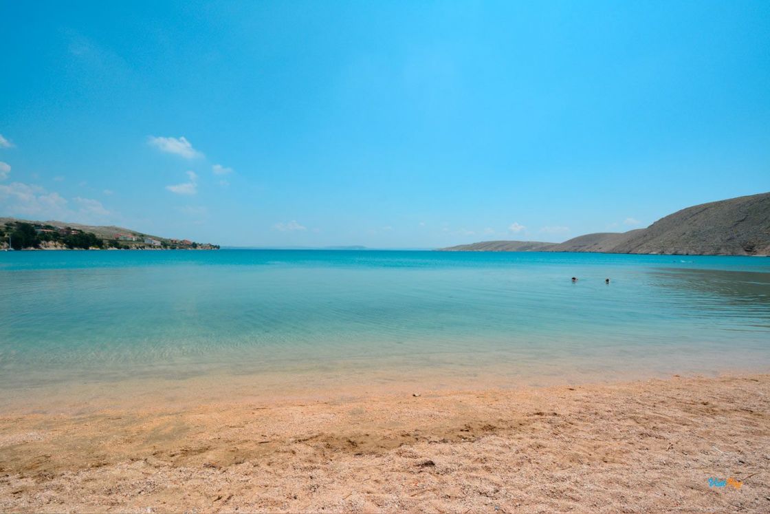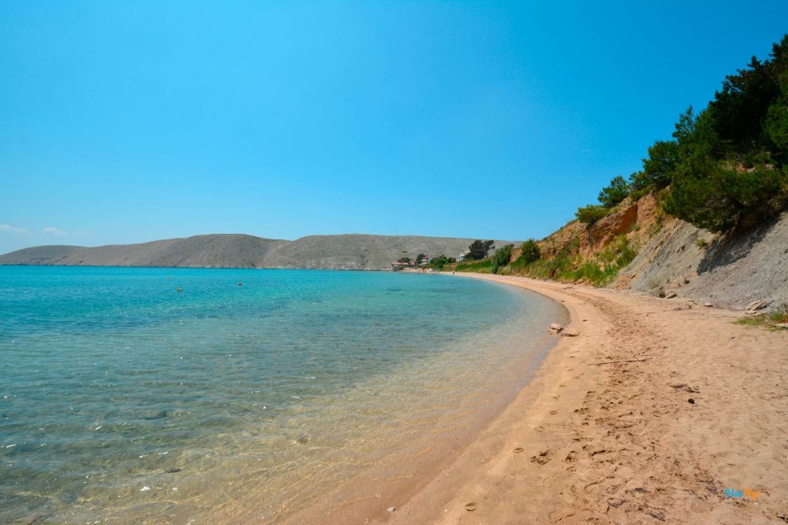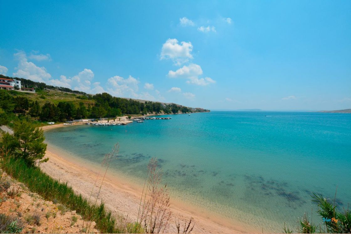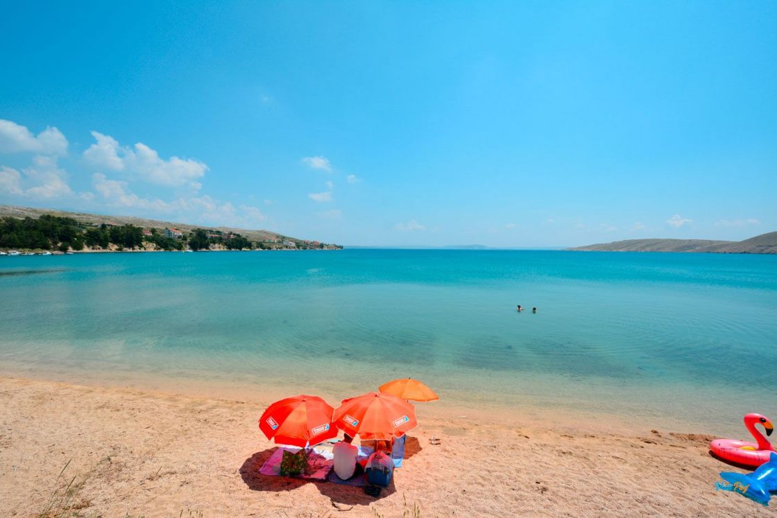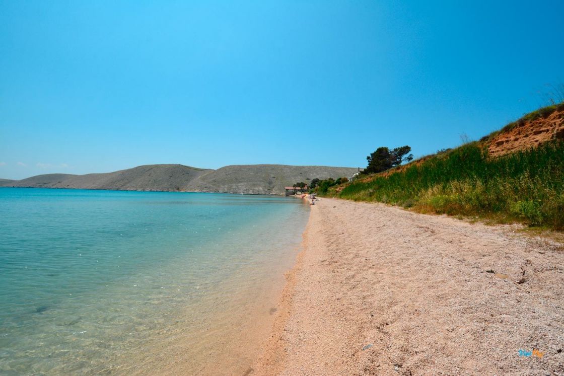 La spiaggia di Vlašići, lunga 800 metri, è una delle spiagge più belle di Pag - è particolarmente adatta per essere circondata da un muro di terra rosso naturale.